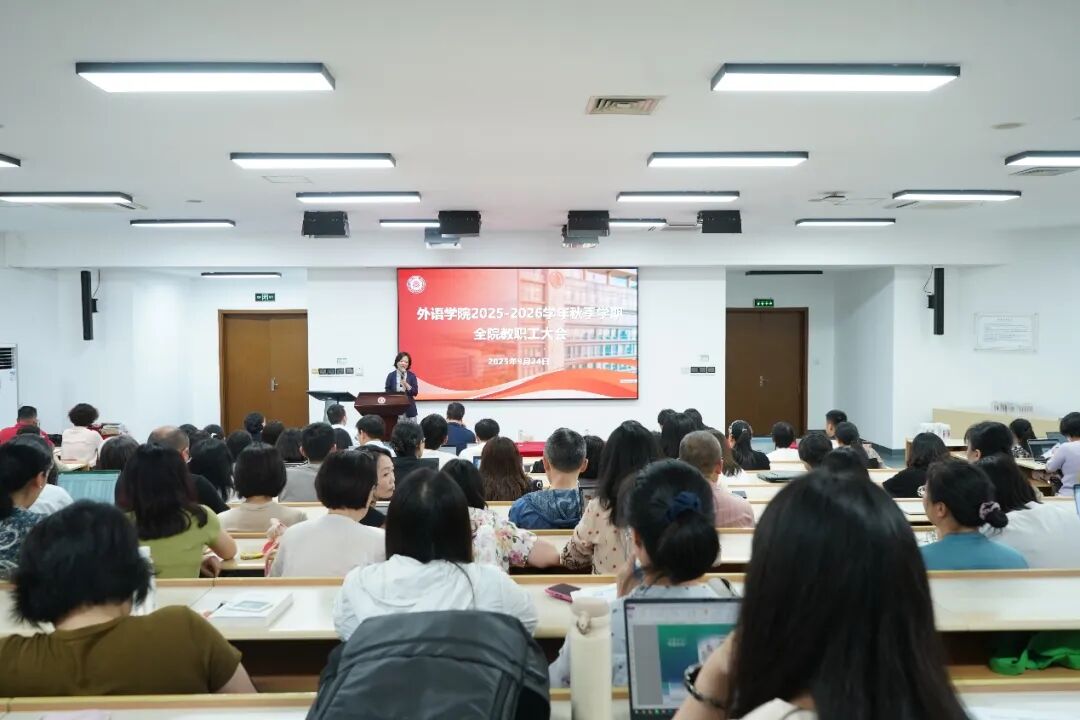 2025年9月24日,麻豆视频 召开2025-2026学年秋季学期全院教职工大会。大会特邀原麻豆视频 外语系主任黄源深教授、人文与社会科学研究院院长吕志峰教授开展主题讲座,全体教职工参加。