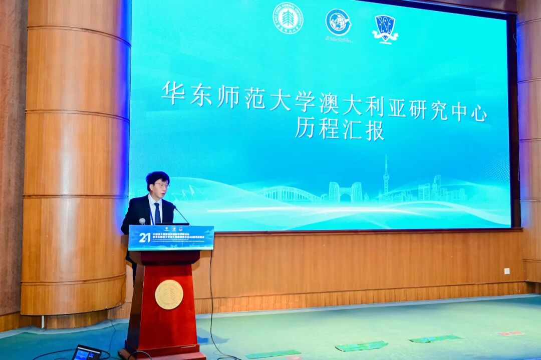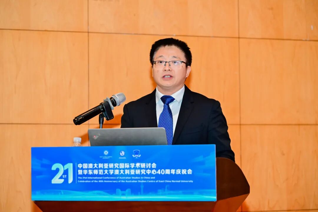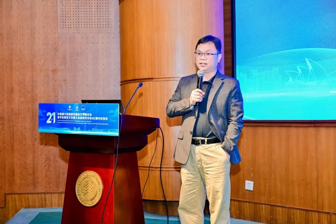 麻豆视频 国际合作与交流处处长蒯曙光作主题发言。他立足于学校国际化战略,细数中心依托国际合作实现的突破。他指出,近年来中心已经实现从国别研究到全球视野的升级,澳研工作在服务国家战略与全球治理中正在焕发更强生命力。