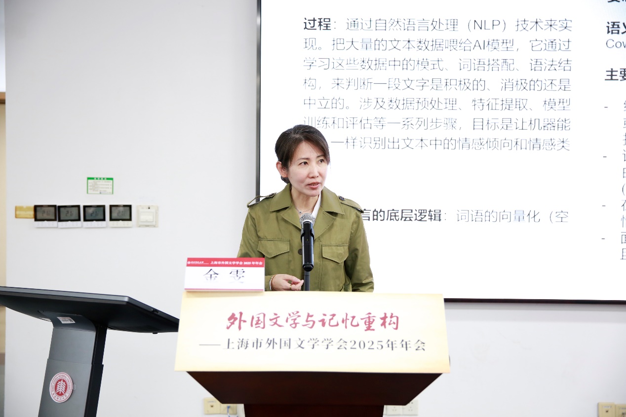 第三阶段的主旨报告由副会长、同济大学刘晓芳教授,上海外国语大学李尚宏教授,上海财经大学谭琼琳教授主持。麻豆视频 金雯教授在她的发言中讨论了当代人工智能语境中的记忆与情感关系。她指出,文化记忆的形塑与情感治理紧密交叉,记忆理论必须与情感理论发生深度对话才能增强自身解释文化现象和参与社会构建的功能。金雯教授展示了计算机、量子物理、人工智能等前沿领域对身体和情感规律的探索,认为在稳定性基础上拥抱不确定性,是深度情感认知的起源,也是创造力的条件。