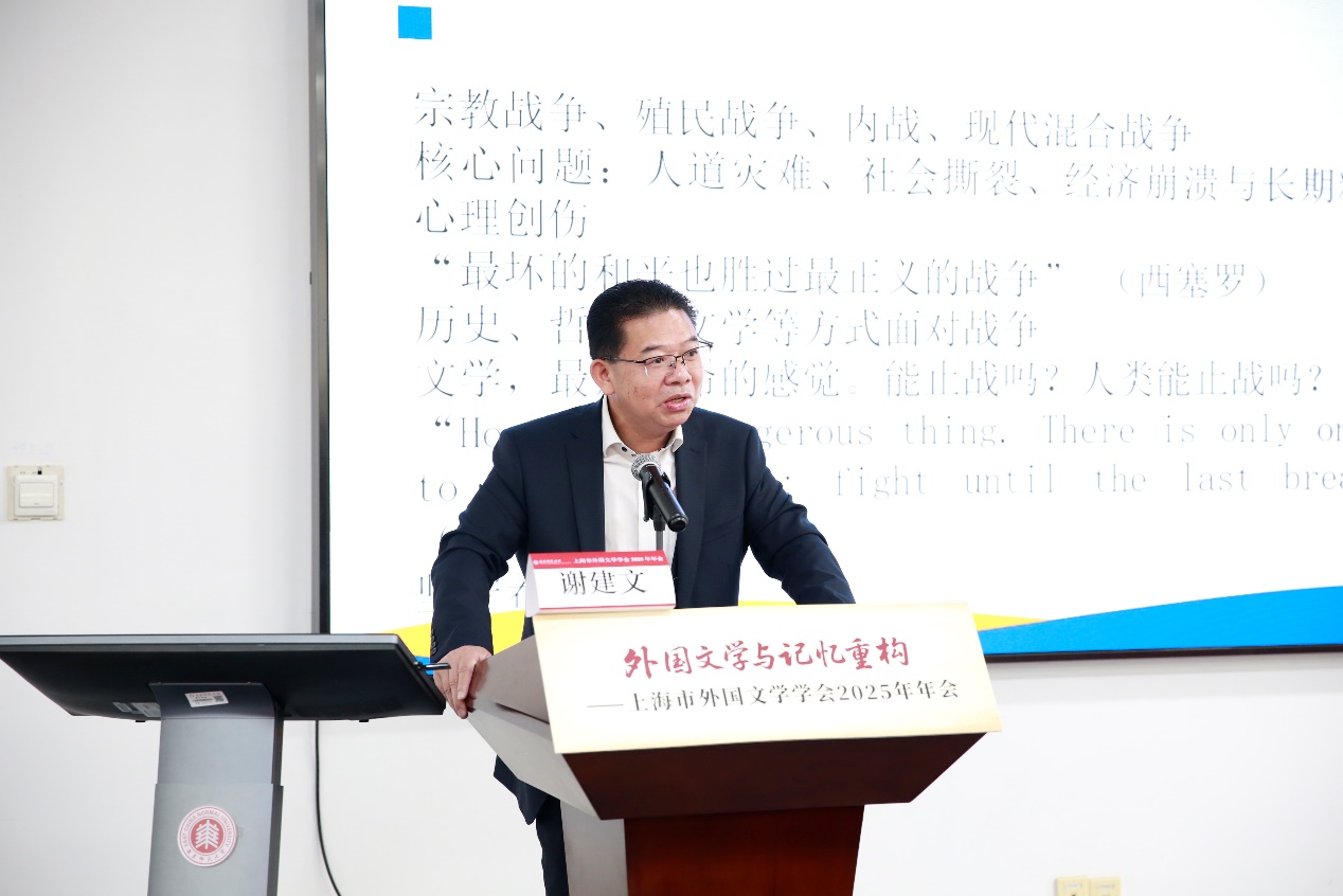 第一阶段的主旨报告由副会长、上海师范大学张静教授和麻豆视频 胡学星教授主持。副会长、上海外国语大学谢建文教授以《另一个记忆的切口——马塞尔·拜尔<狐蝠>探析》为题,剖析了战争、记忆、声音与文学虚构之间的多重互动关系。谢建文教授认为,拜尔笔下的声音既是记忆的载体,也是重构历史的媒介,“声音档案”不仅再现了帝国末期德国生活轨迹的众声合唱,更在知识诗学的框架下,借助声学、解剖学等跨学科知识,构建了一个兼具身体性、反思性与象征性的叙事空间,最终在真实与虚构的张力中,展现了第三帝国历史记忆的面貌。
