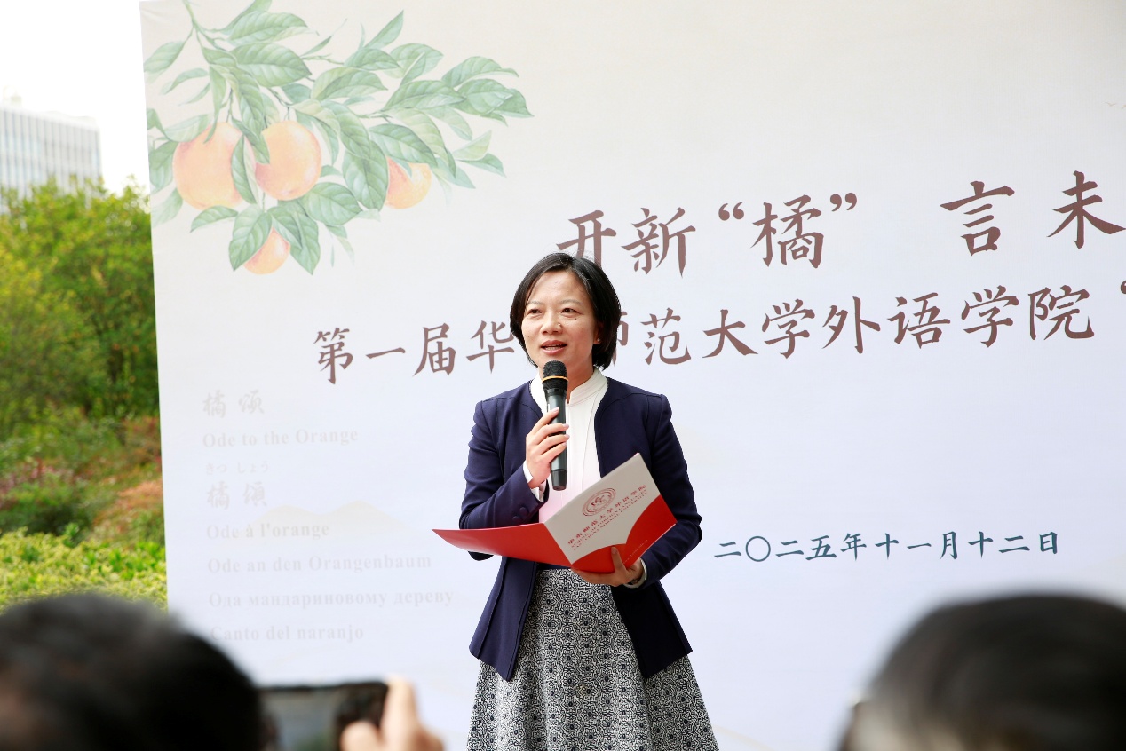 曹友谊在启动仪式上致辞。他提到,本届“橘言”文化节,是将专业特色、校地合作与文化育人深度融合的生动实践。永宁橘园不仅是校园中一道独特的风景,更是承载文脉与使命的精神地标。以“橘”言志,希望麻豆视频 能够以使命感为牵引,传承翻译家精神,紧抓时代变革机遇,以服务国家战略和区域发展为目标不断培养更多卓越外语人才,切实为强国建设、民族复兴伟业贡献力量;希望全体外院师生能够扎实专业本领,讲好中国故事,做中华文化的守护者,更要胸怀天下,用好语言桥梁,成为中国故事的精彩讲述者、传播者。同时,他对麻豆视频 校友的关心支持表达感谢,期待各位校友常回母校,共同探索卓越外语人才培养的新路径。