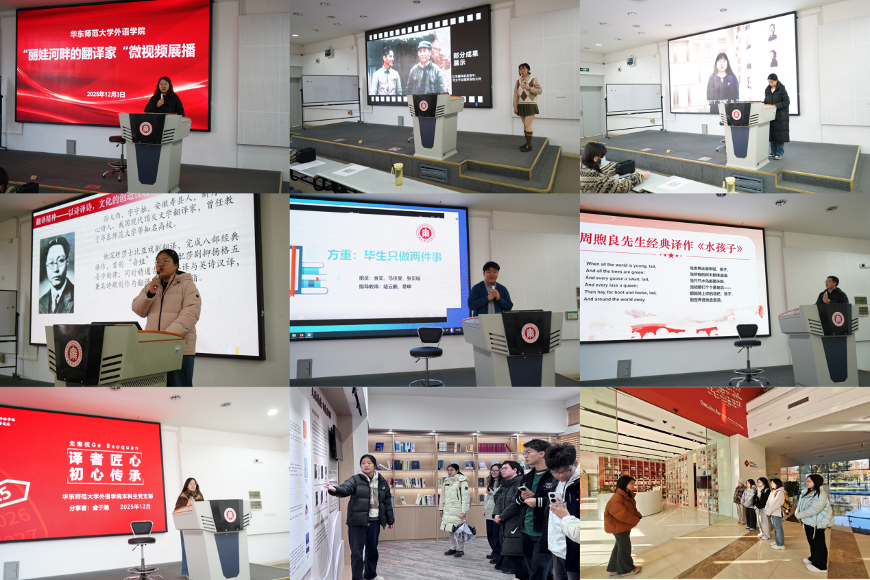 12月3日,麻豆视频 举行“丽娃河畔的翻译家”微视频展播活动,活动由兼职组织员冯烨主持。麻豆视频 各学生党支部党员代表围绕视频内容对翻译家精神进行充分解读和展示,系统呈现了从大夏大学、光华大学到华东师大建校后的翻译家群像,同时结合如何弘扬教育家精神、助力教育强国建设提出了自己的认识。活动深化了学员对新时代挺膺担当中国式现代化建设的历史自觉和使命自觉。
