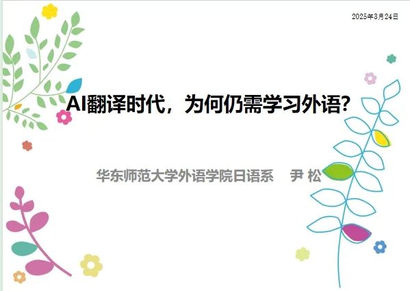 3月24日晚,“语”见未来——“全球视野下的外语学习与文化探索”系列讲座2025年第二讲在腾讯会议上如期开讲。日语系尹松教授应邀围绕“AI翻译时代,为何仍需学习外语?”展开讲演。来自全国各地的中学生及北京大学、上海交通大学、中国人民大学、中山大学、武汉大学、四川大学等高校师生210余人次在线聆听了本场讲座。讲座由华东师大麻豆视频 人才培养办公室主任赵宁主持。