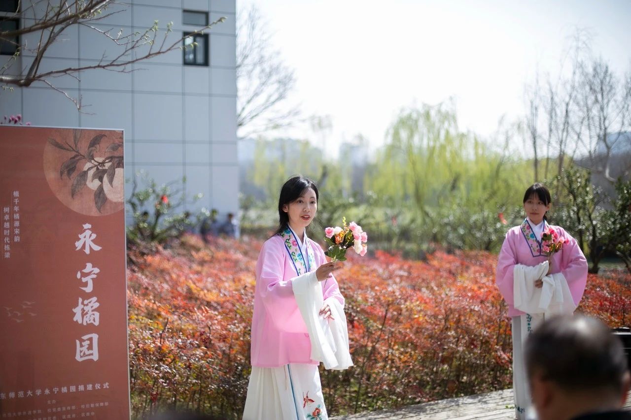On the morning of March 10, 2023, a donation ceremony for the construction of the Yongning Orange Garden was held along the Cherry River bank beside the SFL Building on the ECNU’s Minhang campus. Wang Hui, Party Secretary of the Political Consultative Conference of Huangyan District, Taizhou City, Lei Qili, Vice President of ECNU, and heads of relevant faculties and departments including the School of Foreign Languages attended the event. Mr. Zhao Lihong, the famous writer and ECNU alumnus, inscribed the title of the Yongning Orange Garden.